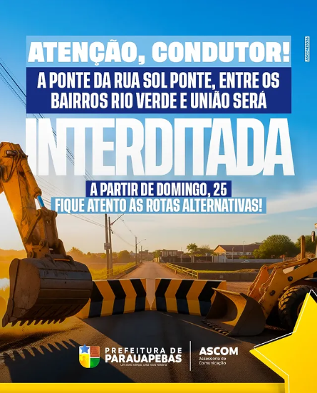 A partir deste domingo, 25, a ponte que liga os bairros Rio Verde e União será interditada para reconstrução completa.