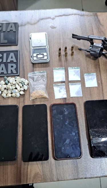 Diante da situação, Anderson Reis Mota Martins foi preso em flagrante pelos crimes de porte ilegal de arma de fogo de uso restrito e tráfico de drogas, sendo conduzido à Delegacia de Polícia Civil para a realização dos procedimentos legais cabíveis.