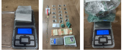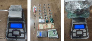 Durante as buscas, foram apreendidos 18 invólucros de substância semelhante à maconha, totalizando aproximadamente 54,3 gramas, além de um papelote com cerca de 4 gramas de substância análoga à cocaína. Também foram encontrados R$ 40 em dinheiro e uma faca.